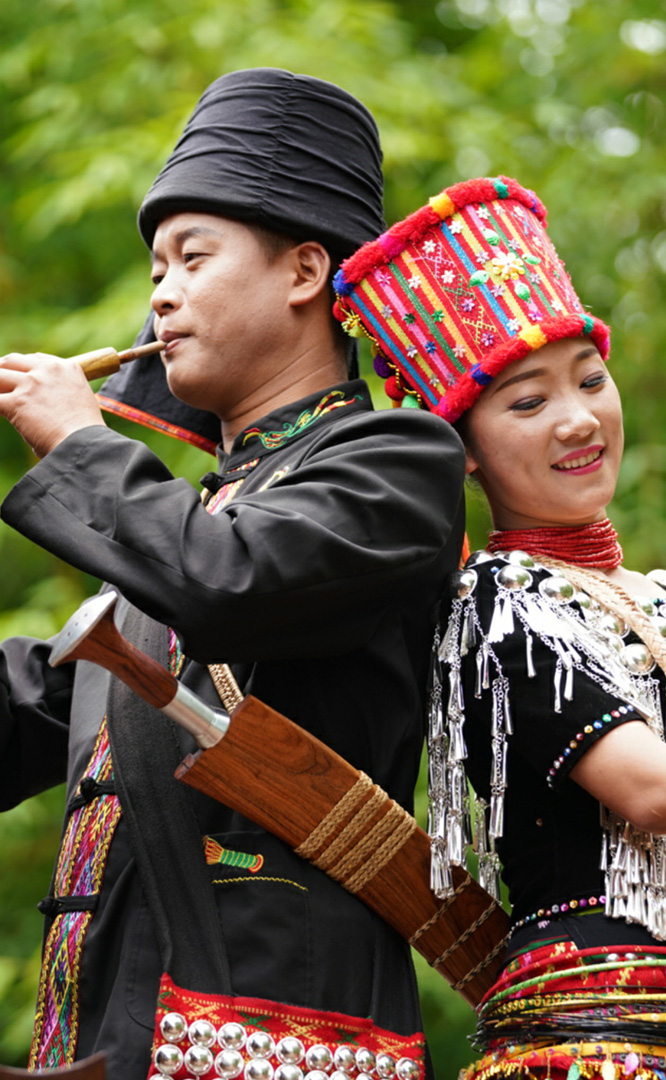 德昂族人口約1.7萬,主要分布在德宏州和保山市的潞西、梁河、瑞麗、隴川、隆陽等縣區(qū)。民居多為草排覆頂竹木結構的干欄式建筑,眼前的德昂村建筑納入了能容納數十人居住的德昂大房子,氈帽頂的小房子,還有頗具浪漫色彩的大公房、小公房……還建有“龍陽塔”標志及佛教奘房、佛塔。德昂族民間普遍信奉南傳佛教,民俗活動與佛事活動關聯緊密。潑水節(jié)、開門節(jié)、關門節(jié)是重大節(jié)日。德昂族服飾色彩豐富,口頭文學特別是民歌創(chuàng)作活動...